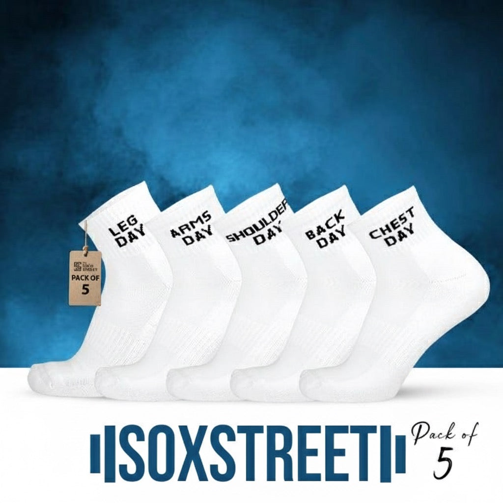 Never guess what day it is again! The Ultimate Gym Day Training Pack gives you a fresh pair of socks for every day of your split. No more frantic searching just pull on the pair for the workout ahead: Leg Day, Arms Day, Shoulder Day, Back Day, and Chest Day.